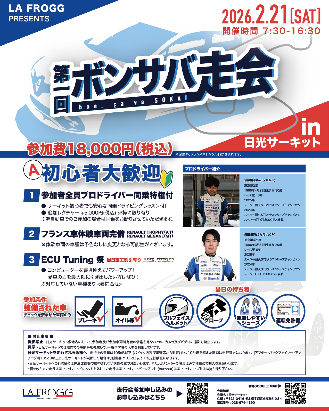 自分の車じゃ不安な方も、RENAULTのTROPHY(AT)、MEGANE(MT)を用意していくので使ってね!!